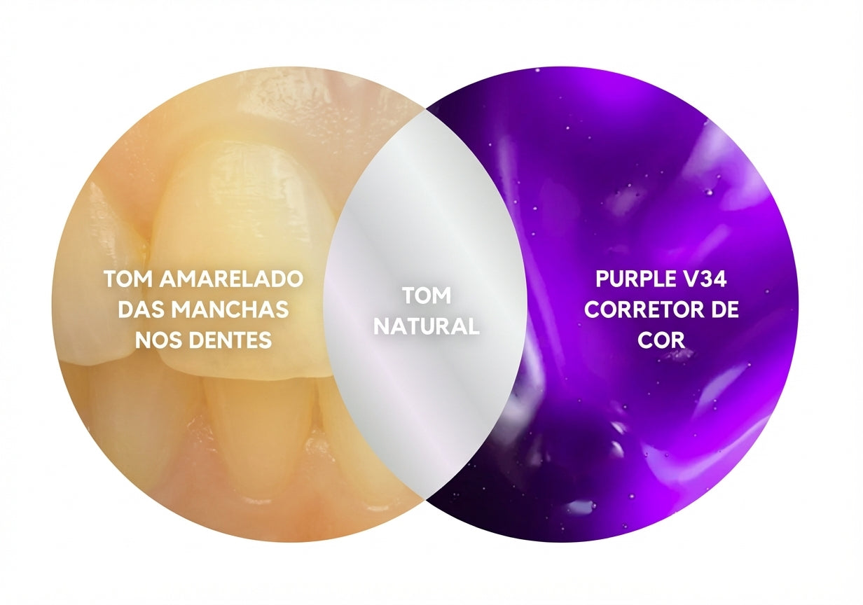 La corrección del color comienza con el círculo cromático , donde el morado y el amarillo son opuestos complementarios . Al aplicar morado en los dientes, neutraliza los tonos amarillentos , eliminándolos y revelando una sonrisa más blanca y brillante . Impresionante, ¿verdad?