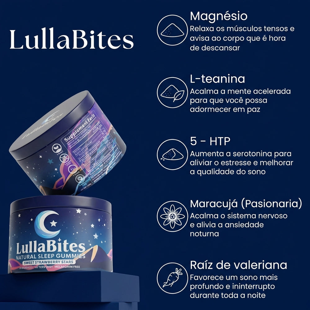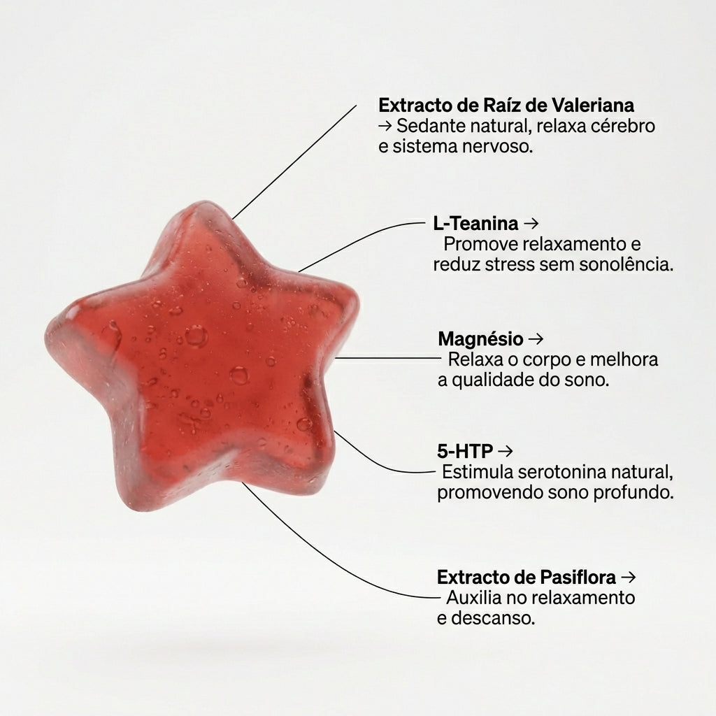 Como nuestras gomas son suplementos naturales en formato de estrella, formuladas para ayudar a relajar la mente, reducir el estrés y promover un sonido profundo y reparador. Contiene ingredientes cuidadosamente seleccionados como Valeriana, L-Teanina, Magnésio, 5-HTP y Pasiflora.